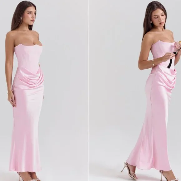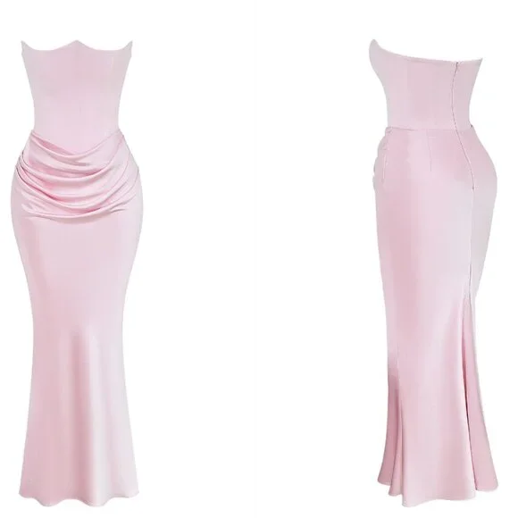 One-part luxe satin and one part stretch crepe, this gown is set apart by its boned bodice and unique peaked neckline.As if the bodice didn’t already cinch you enough, the wrap-around silky skirt begins at the hips and descends to the floor – creating a silhouette that’s nothing short of ethereal.These dresses are brand new, the insid etag has been cut in half to remove the security ribbon